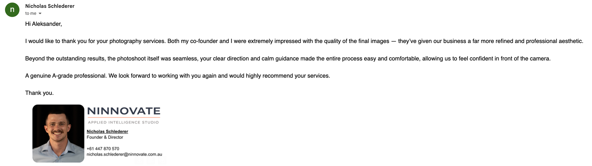 A review left by founder Nicholas Schlederer